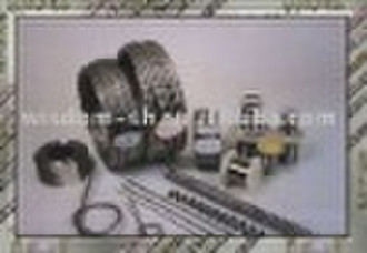 Electrical Resistance wires, Resistance Heating wires, electrothermal wires, electrical alloy wires, alloy wires or strips All wires stable resistance, anti-oxidation, corrosion resistance, high temperature stability characteristics, 1.FeCrAl wires or strips: 0Cr25Al5,0Cr23Al5,0Cr21Al6Nb,0Cr21Al6,0Cr21Al4,0Cr19Al3,0Cr15Al5,Cr23Al5Ti,0Cr27Al7Mo2,etc Main Property of FeCrAl electrical resistance heating alloy Type1Cr13Al40Cr21Al40Cr25Al50Cr21Al60Cr21Al6Nb0Cr27Al7Mo20Cr23Al5PropertyMain Chemical Composition%Cr1215172123261922212326.527.820.523.5Al46244.56.55757674.25.3FeRestRestRestRestRestRestRestReOpportune ammountOpportune ammountOpportune ammountOpportune ammountOpportune ammountOpportune ammountOpportune ammountMn≤0.7≤0.7≤0.7≤0.7≤0.7≤0.7≤0.7Nb0.5Max Continuous Service Temp.of Element950110013001300135014001250Density g/cm37.47.357.17.17.17.17.25Electrical Resistivity1.251.231.41.41.431.531.35Melting Point1450150015001500150015201500Tensile strength Mpa588735637784637784637784637784686784637784Elongation %16141212121212Variation of area%6575657565756575657565756575Bending frequency5555555Hardness200-260200-260200-260200-260200-260200-260200-260Micrographic structureferrite Fferrite Fferrite Fferrite Fferrite Fferrite Fferrite FMagnetic propertyMagneticMagneticMagneticMagneticMagneticMagneticMagnetic 2.Nichrome wires or strips: Cr20Ni80,Cr30Ni70,Cr20Ni35,Cr20Ni30,Cr15Ni60,etc; 3.CuNi wires or strips: CuNi44-1,Monel wire,Dumet wires; 4.Stainless Steel Wires or strips
